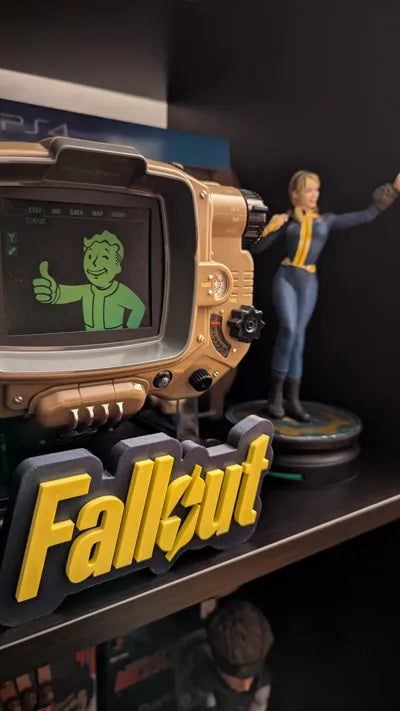 تصميم ثلاثي الأبعاد دقيق وجذاب لشعار لعبة Fallout الشهيرة، يوصل أجواء ما بعد الدمار النووي بأسلوب كلاسيكي فني — مثالي لديكور الجيمنغ أو لهواة السلسلة 🎯