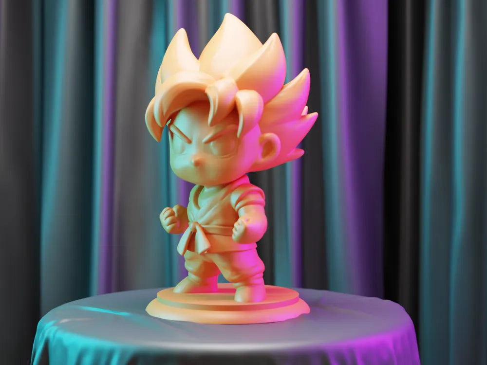 تصميم ثلاثي الأبعاد لطيف ومليء بالطاقة لشخصية سون غوكو الشهيرة من أنمي Dragon Ball، بأسلوب تشيبي كرتوني محبوب يجعل المجسم مثالياً لهواة الأنمي والمجسمات المصغرة 💫
